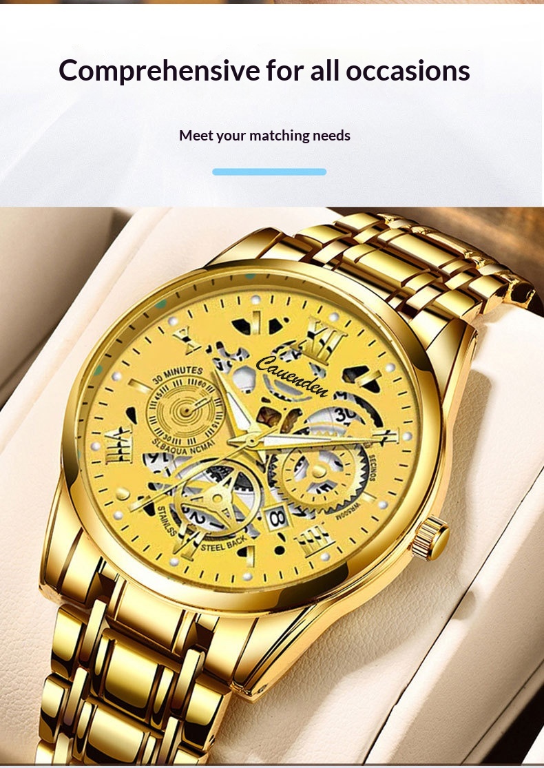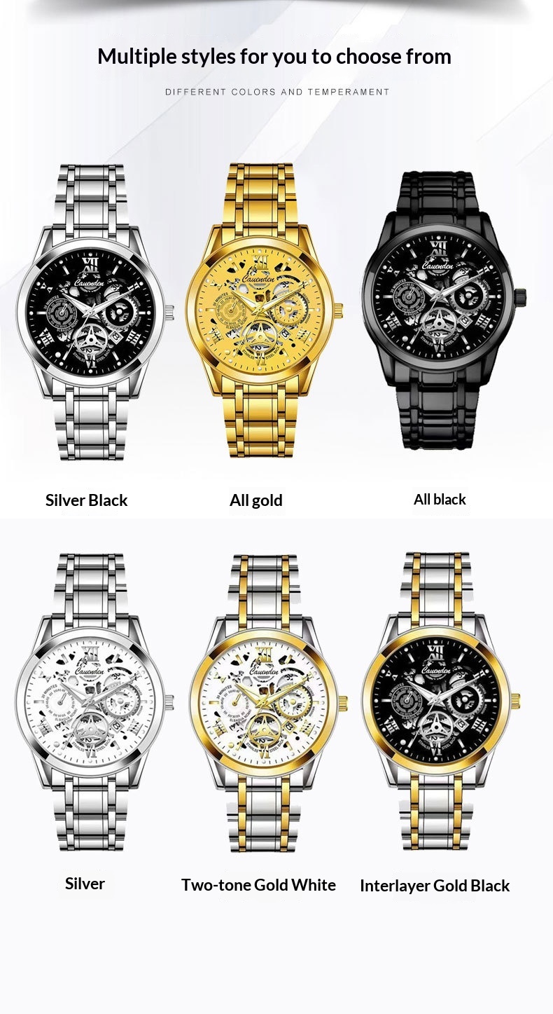 Color: Gold case with a gold dial, silver case with a black dial, black case with a black dial, bronze case with gold stripes, silver case with a white dial, white dial with gold stripes, black dial with gold stripes
